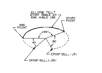 When using an arc or an ellipse, the amount of extension is based on the angular sweep of the object. For example, an arc which is defined from 10_ to 80_ has an angular sweep of 70_. Therefore, a scalar value of 1.5 would return the coordinates of a point on the extension 35_, 1/2 the total sweep angle, past the end of the arc. Since arcs and ellipses are constructed in a counterclockwise direction, a positive scalar value assumes an extension in the counterclockwise direction and a negative scalar value assumes an extension in the clockwise direction, with respect to the CSYS of the conic.
