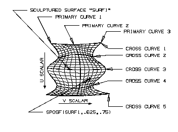 For the sculptured surface, the U scalar pertains to the primary curves,and the V scalar pertains to the cross curves. The directions of both U and V depend on the order in which the curves were selected. In addition, the extension of sculptured surface is developed in the same manner as the surface itself, which depends on such factors as order of selection, curvature, etc. Therefore, determining where the position on a surface extension lies may be only an approximation.