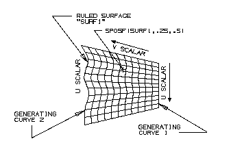 The U scalar pertains to the two generating curves, and the V scalar pertains to the rulings. Since two curves are used to generate a ruled surface, the U scalar value is applied to both curves. The desired position lies on the surface, on a line connecting the two calculated positions based on the U scalar. The distance "up" the line is dependent on the V scalar. The V direction is dependent on the order in which the generating curves were selected. Zero lies at the first curve selected, and one lies on the second.