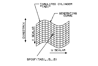 For the tabulated cylinder, the U scalar pertains to the generating curve, and the V scalar pertains to the directrix. Extensions off the surface are generated according to the type of curve in each direction. The generating curve may be any Unigraphics object, therefore, the extension my be calculated in several different ways. For information on extensions in the generating curve direction, refer to the specific object type in the CPOSF function.