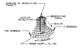 The U scalar pertains to the generating curve, and the V scalar pertains to the circular grid lines. For information on extensions in the U direction, refer to the specific object type in the CPOSF function discussed earlier. For the V direction, refer to arcs and ellipses under CPOSF.