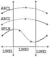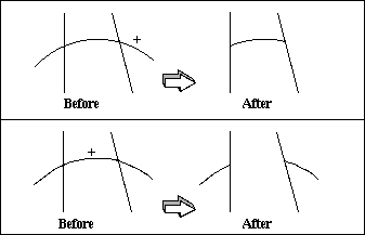 Minor word indicating that a reference point follows. That reference point can either be a point object, or three coordinates. The segment of the curve that is closest to the reference point is trimmed when you have a single bounding curve. When you have two bounding curves there are two cases that can occur: the reference point is inside the bounding curves or outside the bounding curves. In Figure below, the two straight lines are the bounding curves and the arc is the curve to trim. The "plus" signs indicate the reference points. When the reference point is outside the bounding curve, all segments outside the bounding curves are trimmed. When the reference point is inside the bounding curves, all segments inside the bounding curves are trimmed.