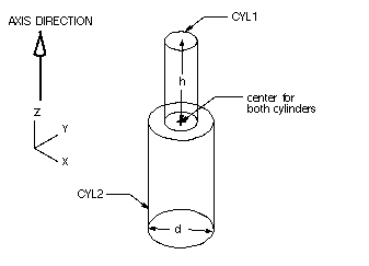 Creating two cylinders, both with the same center. One cylinder (CYL1) is created with a positive height value, the other (CYL2) with a negative height value. The axis for both is specified in the positive Z direction.