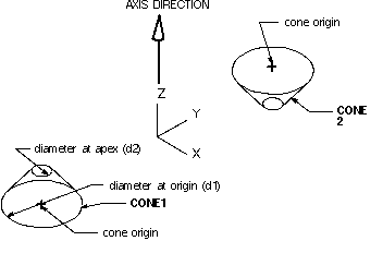 Demonstrates the creation of two solid cones, one (CONE1) with a positive height value, the other (CONE2) with a negative height value.