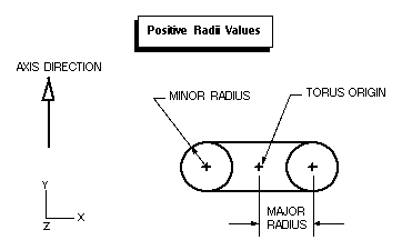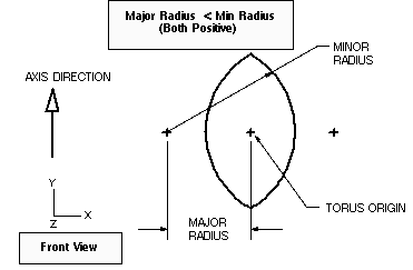 Major radius of the torus. If you enter a negative major radius, then the minor radius must be greater than the absolute value of the major radius. Refer to Figure 1-9, Figure 1-10, and Figure 1-11. |