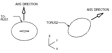 This example demonstrates the creation of two tori, one (TORUS1) with positive radii values, and the other (TORUS2) with a negative major radius. TORUS1 has the default axis parallel to the ZC axis, while TORUS2 has an axis defined as parallel to the YC axis.