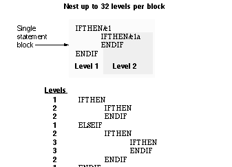 The BLOCKIF statement which begins the construct. It evaluates the logical expression passed to it. If the expression is true, it executes the accompanying block. Up to 32 levels of IFTHEN statements can be nested per block as shown in Figure 1-11.