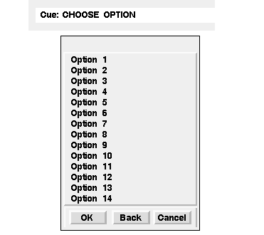 The response values 1 through 4 are reserved for the Back, Cancel, and the alternate action option. Therefore, the first value available from the menu options is 5. The first option on the created menu returns 5, the second option returns 6, the third, 7, and so on. There is a maximum of fourteen options on a menu. The following list shows the values that may be assigned to the response variable according to which option is chosen: