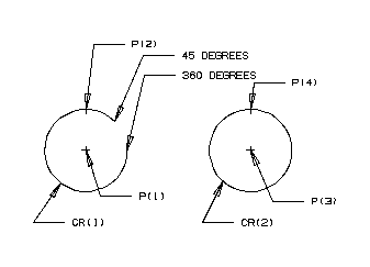 CR(1)=CIRCLE/CENTER,P(1),P(2),START,45,END,360