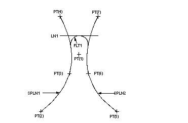FLT1=FILLET/SPLN2,LN1,SPLN1,CENTER,PT(1),NOTRIM