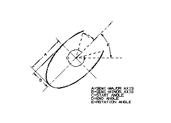 An ellipse is a form of a conic and is created by specifying half of the major axis (semi-major) and half of the minor axis (semi-minor). Ellipses are created in a counterclockwise direction from the positive X axis of the work coordinate system. The start and end angles may be specified to obtain only a partial ellipse, however, if they are omitted a full ellipse is created.