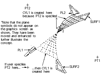 Creating a cylinder tangent to two previously defined sheets. The cylinder is bounded by two planes (PL(1) and PL(2)). In this case the planes intersect causing the possibility of two cylinder halves to be created. The half closest to PT2 is created.