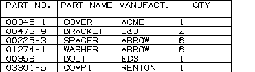 All assigned attribute values that match the attribute titles specified in the parts list format are added to the parts list. The attribute value for 'Material' is not added, as that attribute title was not specified in the parts list. A quantity of 1 is also added, since only one instance of COMP1 was specified in the statement.