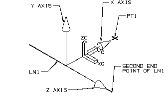 Creating a coordinate system by specifying a previously defined line and point. The line establishes the Z axis, and the second end point of the line establishes the direction of positive Z. The positive X axis passes through the previously defined point.